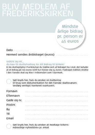 Ønsker man derudover at støtte kirkens arbejde, kan man sende et bidrag til kirkens præst eller til kirkekontoret, og ønsker man en kvittering til det franske skattevæsen sendes den gerne. Betaler man skat i Danmark, er det muligt at få overført sin kirkeskat til Frederikskirken - en god og nem måde at støtte Frederikskirkens arbejde på.